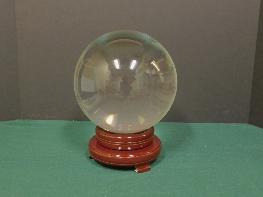 Big and beautiful 8 inch diameter clear crystal ball on a quality wooden stand. Perfect for mystical, fortune teller or seance decor. Life size skull not included. Included for scale.