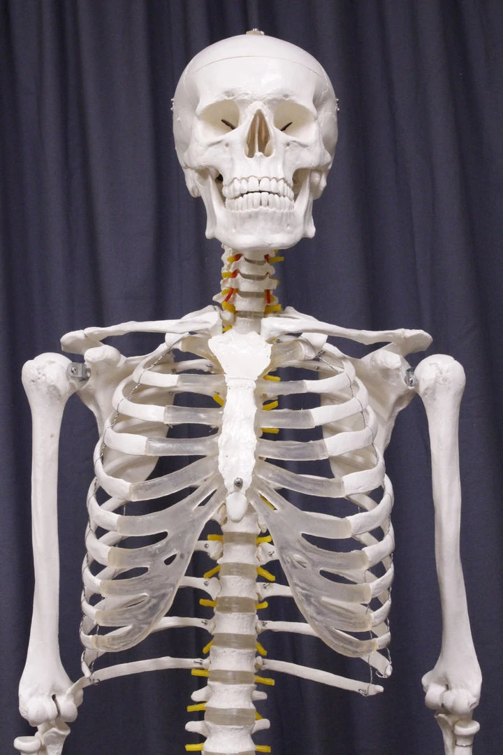 This life size human skeleton replica makes a great medical skeleton or human skeletal model. Features include ribs that are clear where the rib would be cartilage. The skeleton can hang from the D ring on top of his skull. Skeleton includes a rolling stand the supports it from the pelvis.
