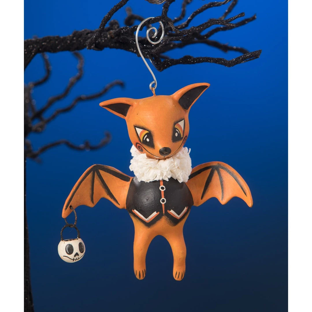 This sweet Halloween bat ornament by LeeAnn Kress made of handpainted resin, crepe paper and wire is a spooky addition to your holiday tree. Dimensions: 4.5″ X 4.5″ X 1.75″