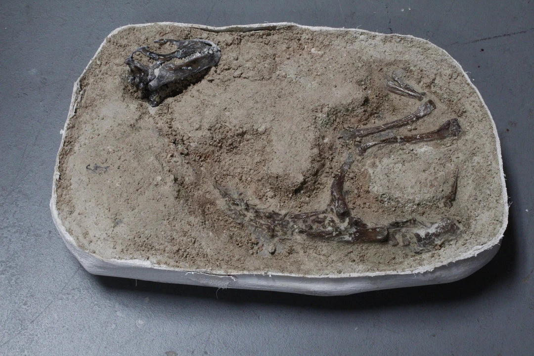 When a fossil is found at a dig site a trench is dug around it and the entire specimen, bones, rock, sand and all, are removed, wrapped in plaster and sent back to the lab for cleaning and cataloging. This prop represents a field specimen that is about halfway through the cleaning process. It features removable sand, a removable skull, and a complete dinosaur fossil. Dinosaur would have been roughly 2 feet tall and 4 feet long. Dimensions: 27x18x5 – 31 lbs