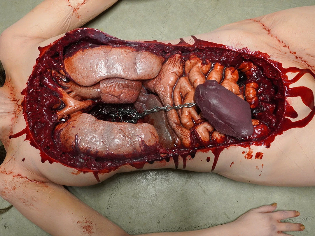 Gory female autopsy body with a hidden chamber in her chest cavity. Perfectly creepy place to hide a clue for escape rooms or immersive haunted house experiences.