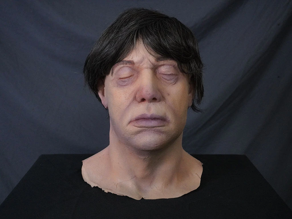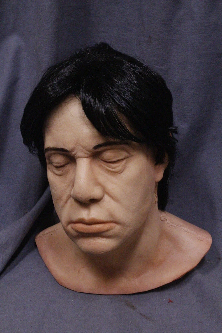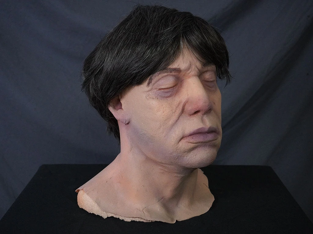 Life size, life cast middle aged to elderly male head with eyes closed and jowls.