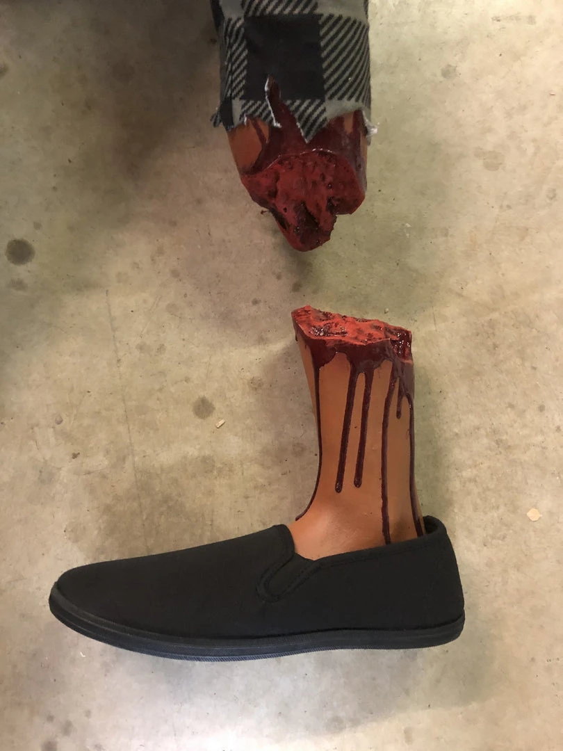 4’8″ child with bomb and burn wounds and an amputated foot (included).