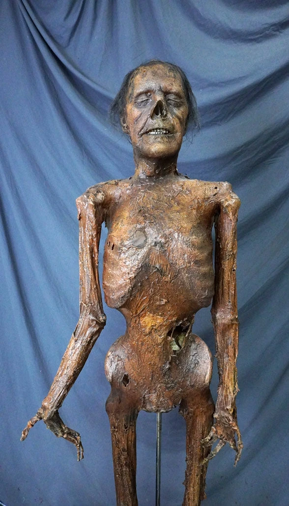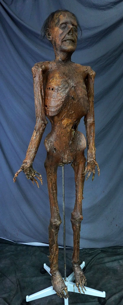 Mummified lifesize skeleton with realistic Boris face and super strong, super flexible, and super realistic skin. Skin is embedded with tear-resistant mesh. Great for situations such as haunts, escape rooms, and stunts, where stress and rough handling are expected.
