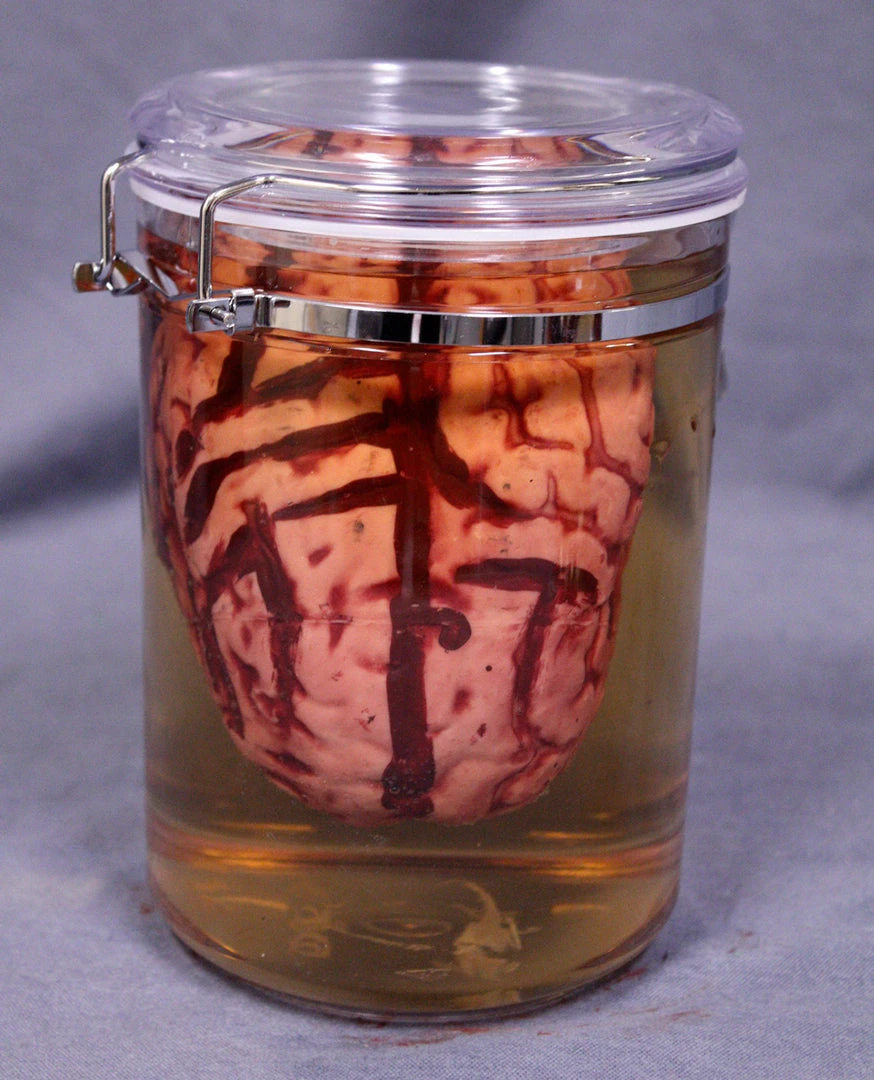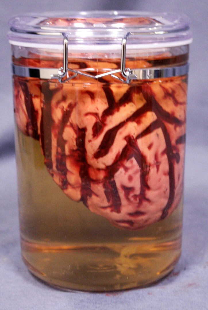 Vinyl rubber brain in a shatterproof acrylic apothecary jar.