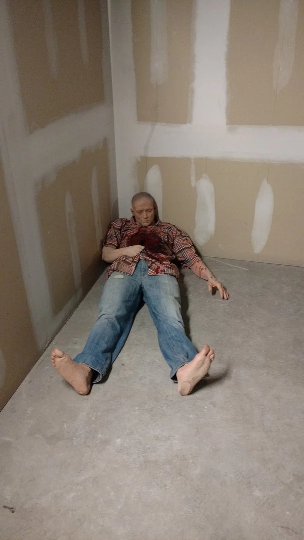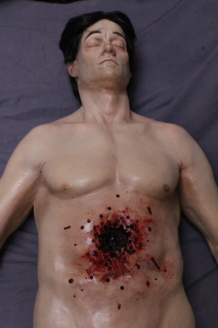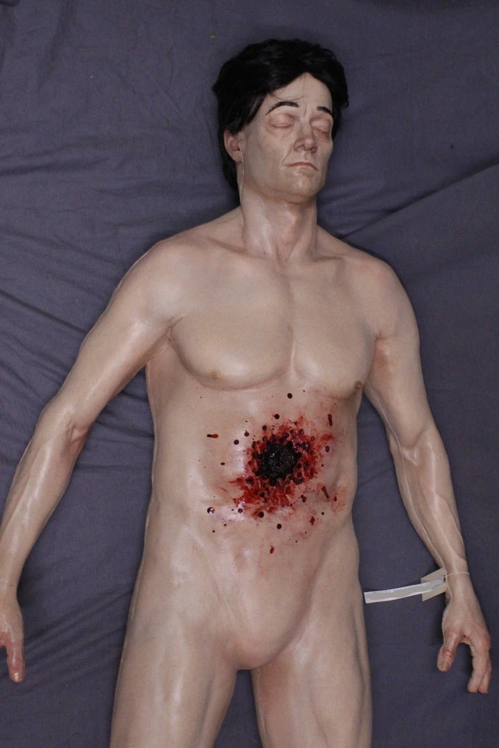 This anatomical male jack body is made in polyfoam rubber and has a gory buckshot wound on his belly from a shotgun.