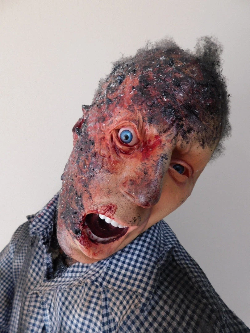 Poseble polyfoam male body covered in burn wounds. Includes tattered clothing and stand.