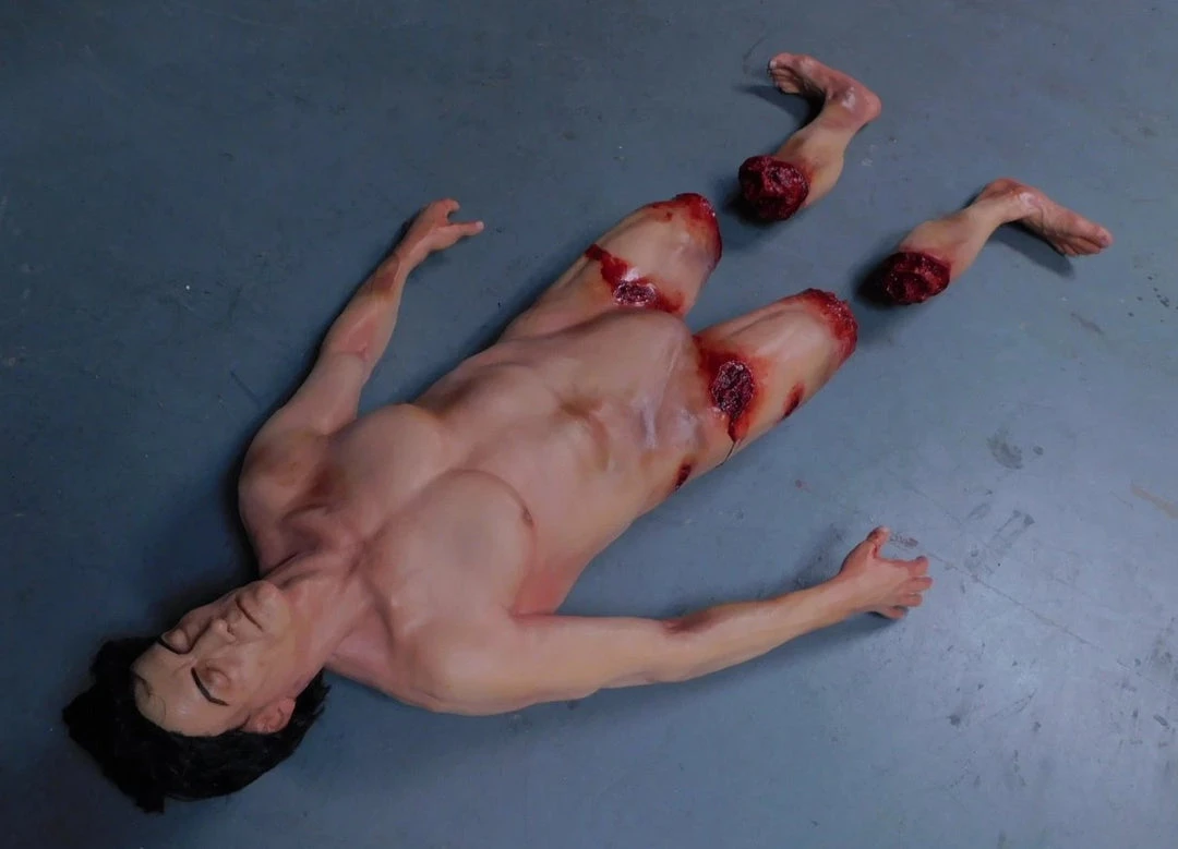 Lifecast Jack body with realistic wounds depicting dismembered legs as may occur in a bomb blast or vehicular accident. Made with durable rubber skin and polyfoam. With facial hair and eyebrows. Shipping Dimensions: 72″ x 24″ x 12″