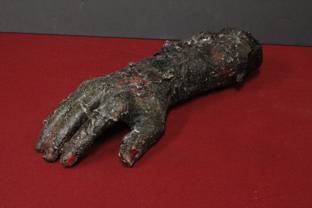 This is one crispy hand. This prop has been hand painted to represent the arm of a victim of arson, or just someone who was in the wrong place at the wrong time.