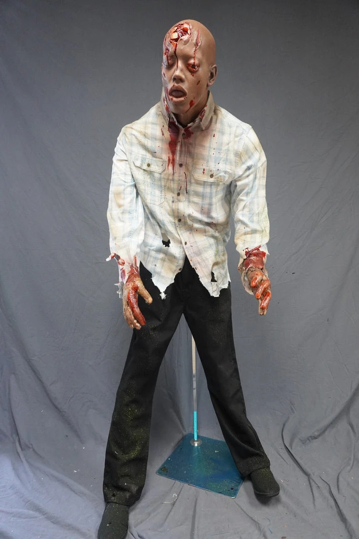 Lifesize standing zombie figure. Gory bashed-in lifecast head and bloody poseable mannequin body.