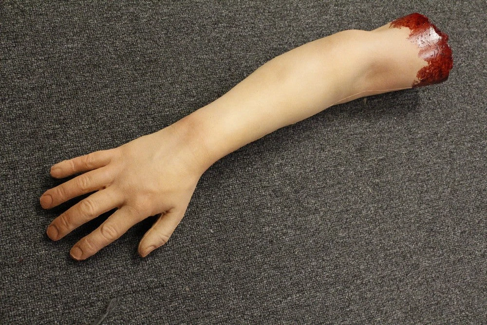 Male right arm prop. Available in a variety of skin tones and with or without gore. Fake arm extends two-thirds up bicep.
