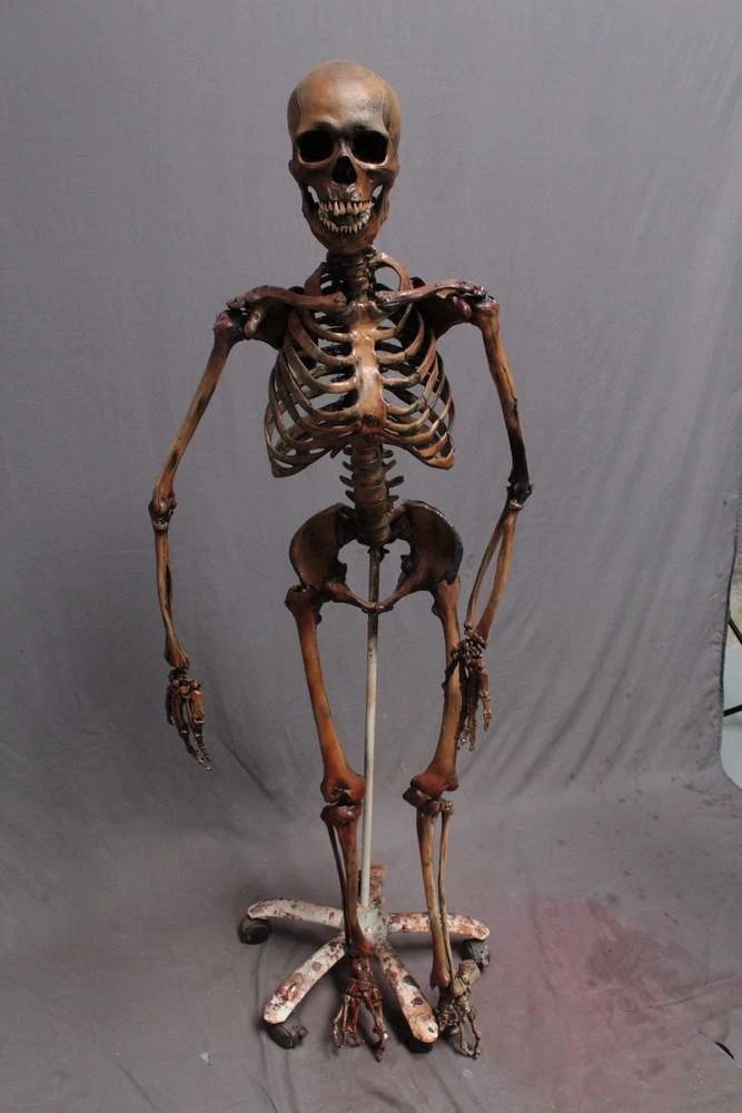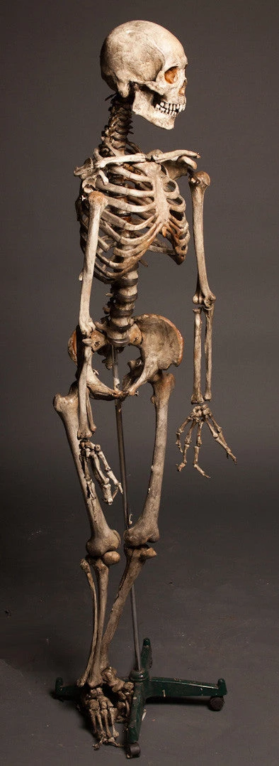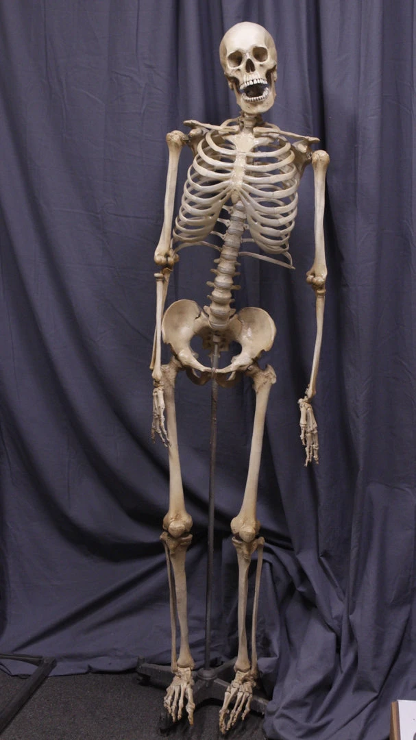 An seamless skeleton replica with hardware removed to look like a natural skeleton with lifecast skull. Comes with all bones and stand. Made up of PVC resin. In height is 64″ and in width is 16″.
