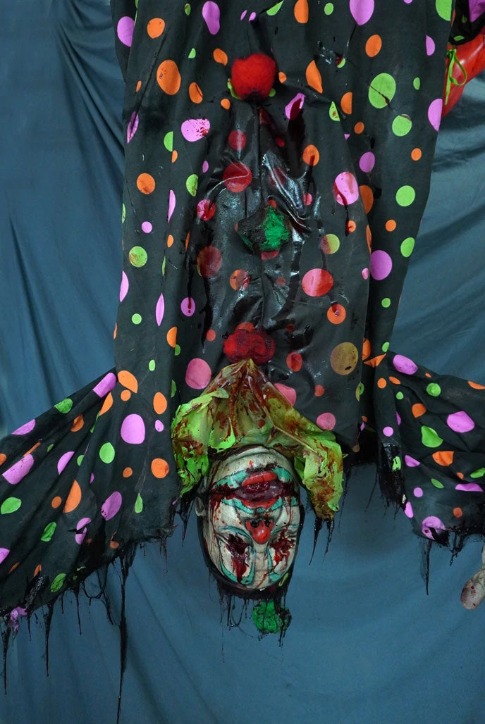 Terrifying life size scary clown dummy. Creepy head with gouged eyes, cut out tongue and elongated smile and lifecast hands attached to poseable full canvas dummy. Put into different poses or hang from heads or feet in your haunt.