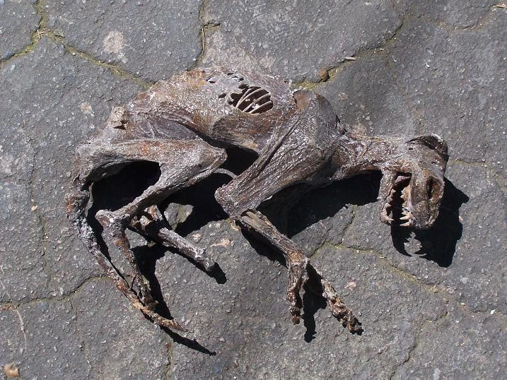 This mummified cat has latex weathered skin over a posed cat skeleton.