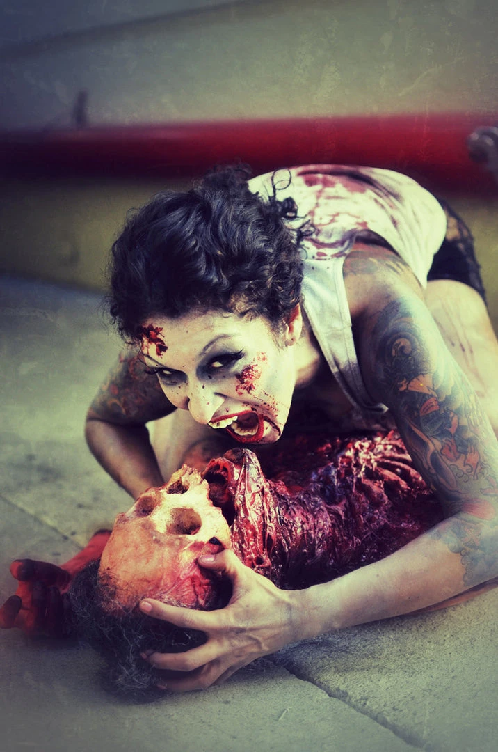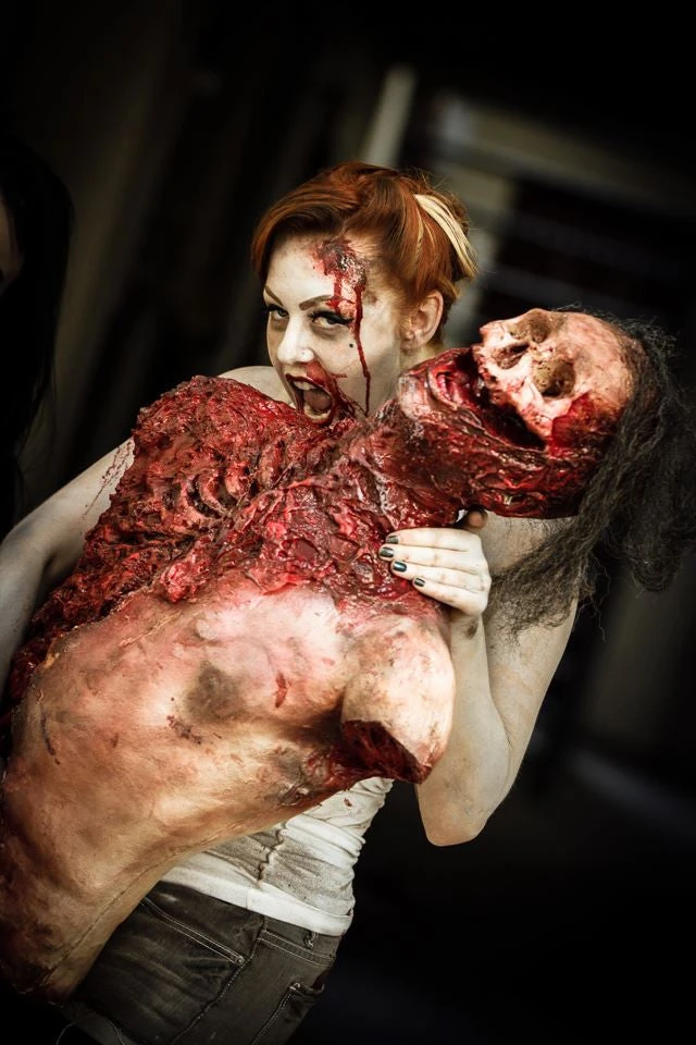 Our deluxe skull and gore torso features a male torso, half shredded down to the meat with exposed ribs and a head with hair and partially exposed lifecast skull.