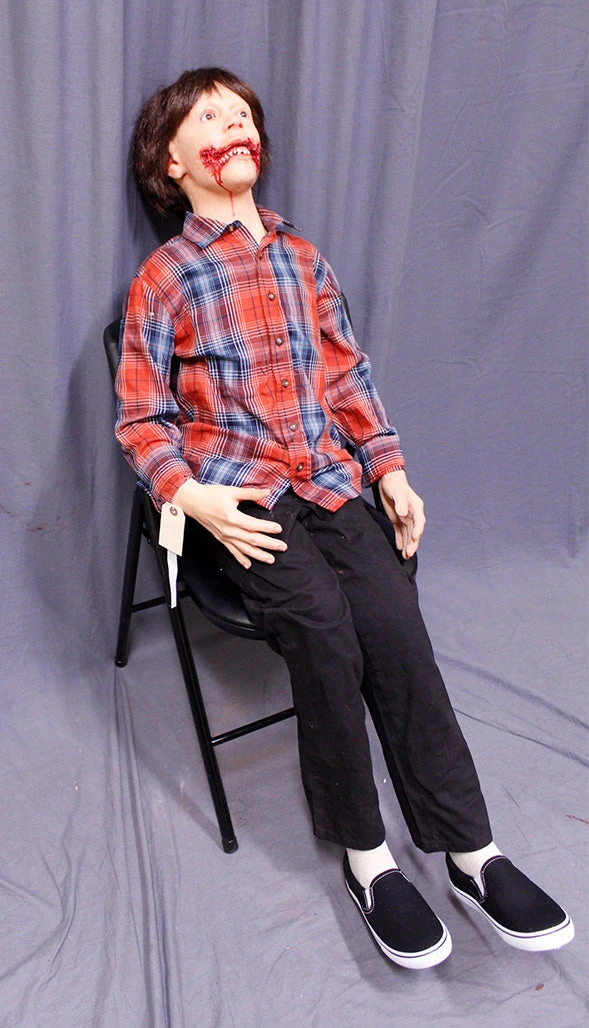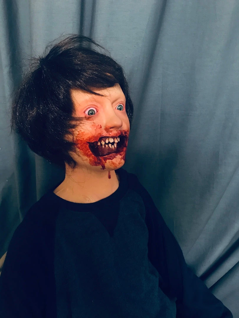 Ripped open mouth child figure for dental horror themes. 54″ tall child body with poseable arms and legs. Gender neutral face and body type to be styled as either a male or female child with wig and costume. Dummy body with lifecast head and hands. Pictured sitting. Also stands with removable stand.