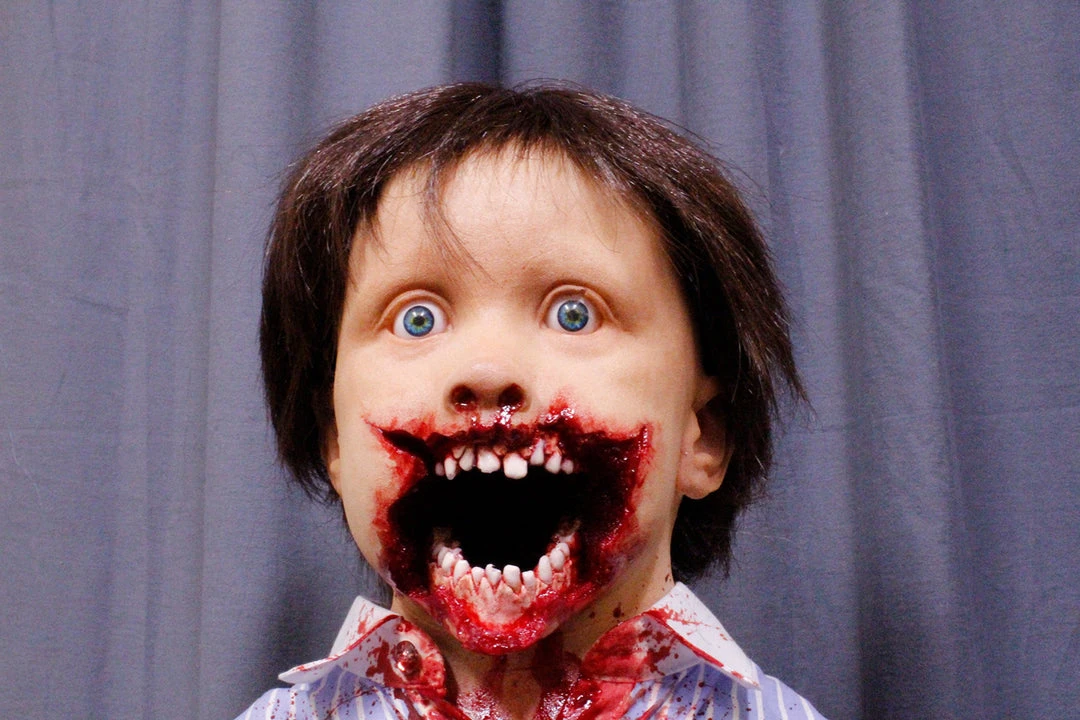 Ripped mouth toddler figure for dental horror themes. 42″ tall poseable toddler child dummy with stand. Lifecast head and hands with detailed extreme gore.