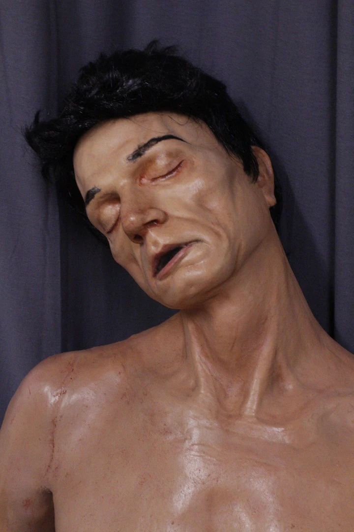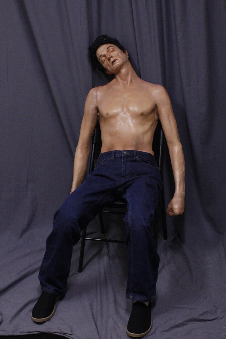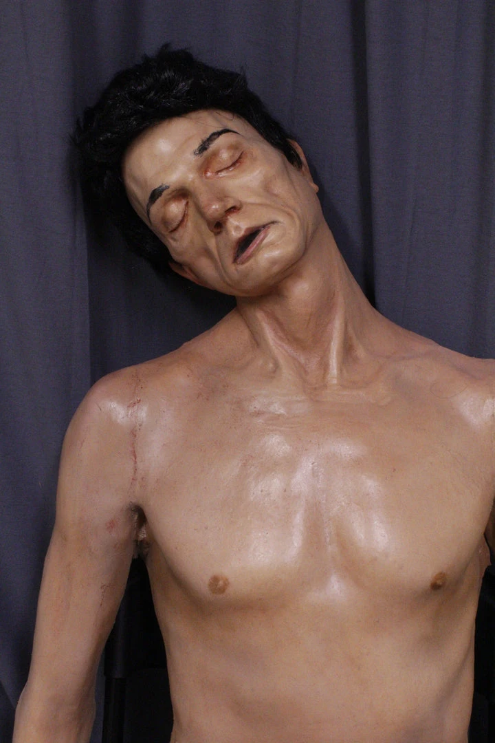 Closed eyed Alan dummy with lifecast upper body and arms in industrial strength urethane rubber. Lower body is poseable canvas dummy legs. Great combination of strength, detail, and flexibility. Can be displayed sitting or laying.