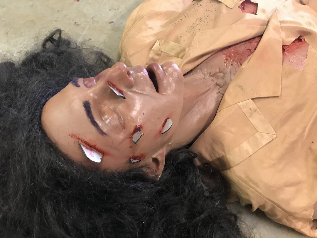 Stunt dummy made of foam filled industrial strength urethane rubber for high durability in all situations. Features hair and eyebrows, clothing, shoes, and wounds. Weighs roughly 40lbs. Fully poseable canvas lower body and lifecast rubber upper body.