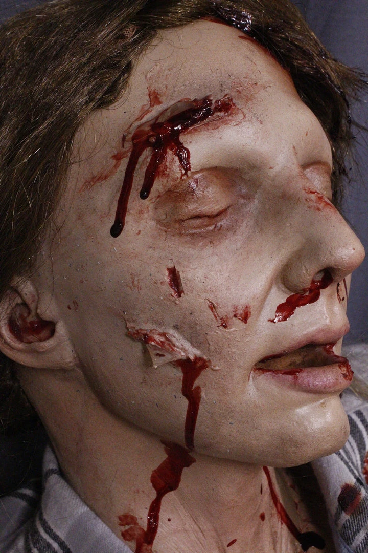 Fabricated to represent a realistic car crash victim with the following wounds: