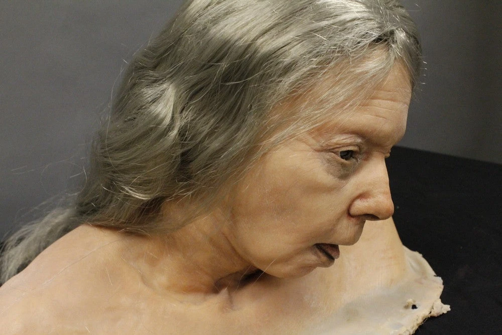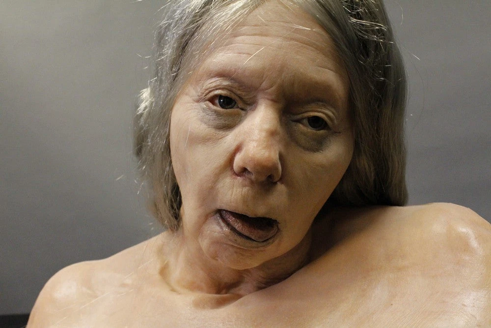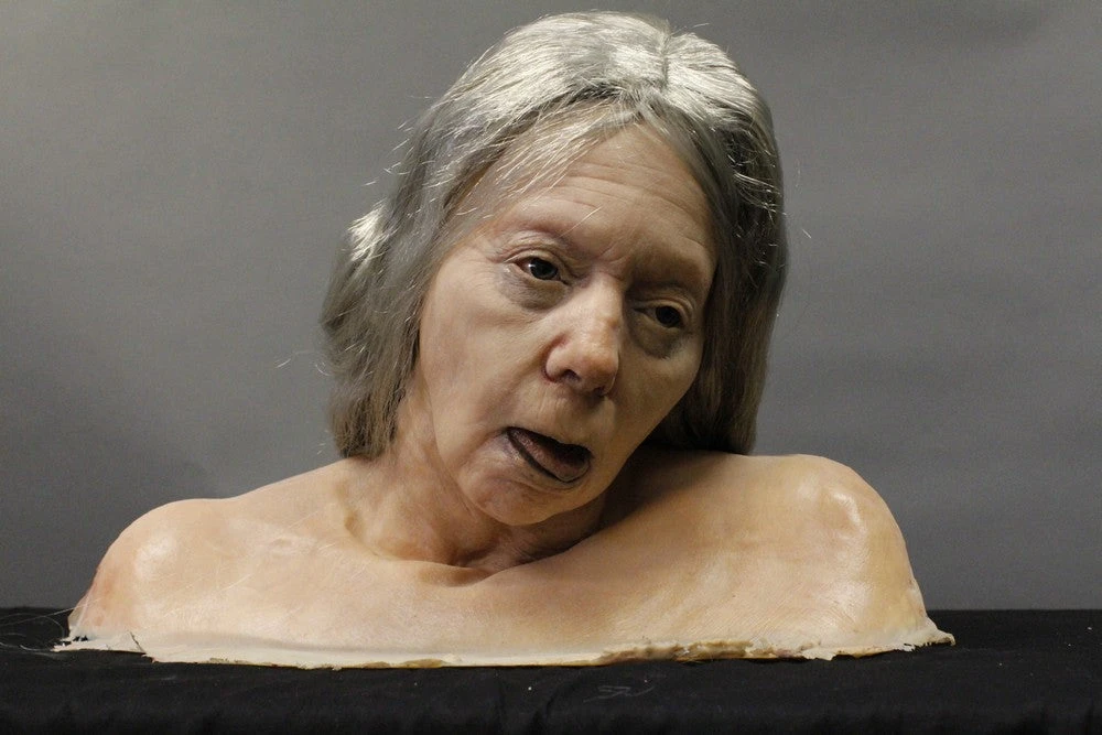 Life size, life cast elderly female head with open eyes, slack-jaw and extruded tongue. Cast in high-strength, high-detail urethane rubber skin. Includes wig.