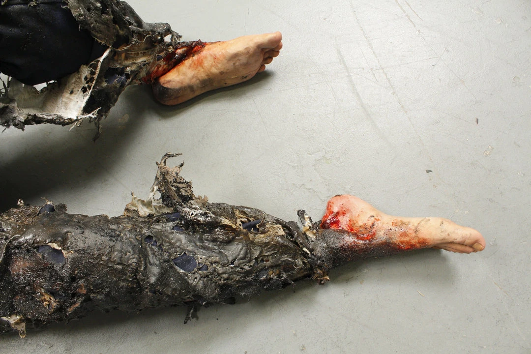 Alan dummy made of hi-strength, hi-flex urethane rubber with fully poseable arm, legs, and waist. Burn effect covering entire body and clothing, with some intact flesh on his feet to replicate the fire protection that leather shoes often supply.