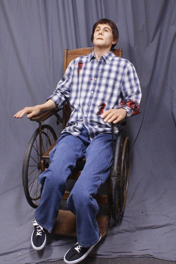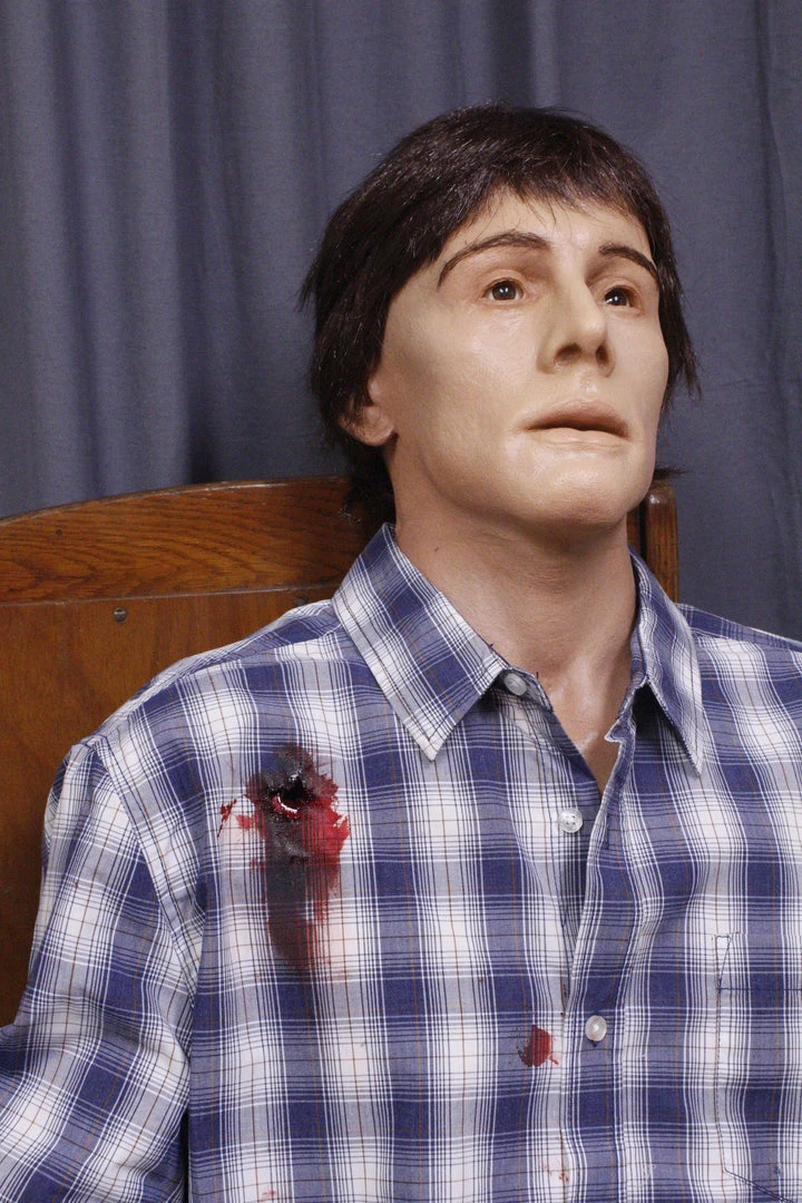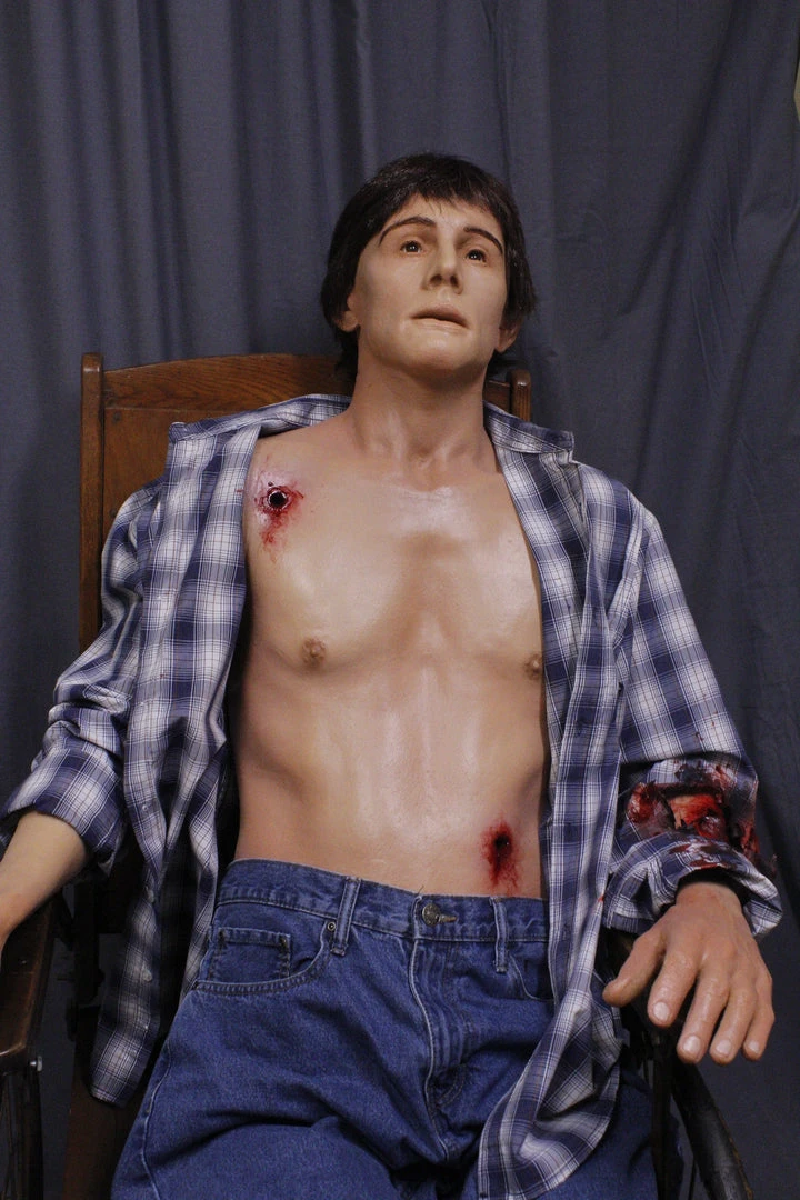 Open eye Joe dummy with lifecast upper body and arms in industrial strength urethane rubber. Two critical gunshot wounds in torso and one defensive arm gunshot wound. Lower body is poseable canvas dummy legs. Great combination of strength, detail, and flexibility. Can be displayed sitting or laying. Brown wig & eyebrows. Clothed.