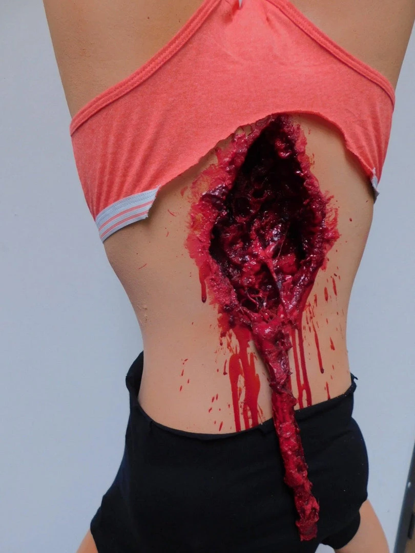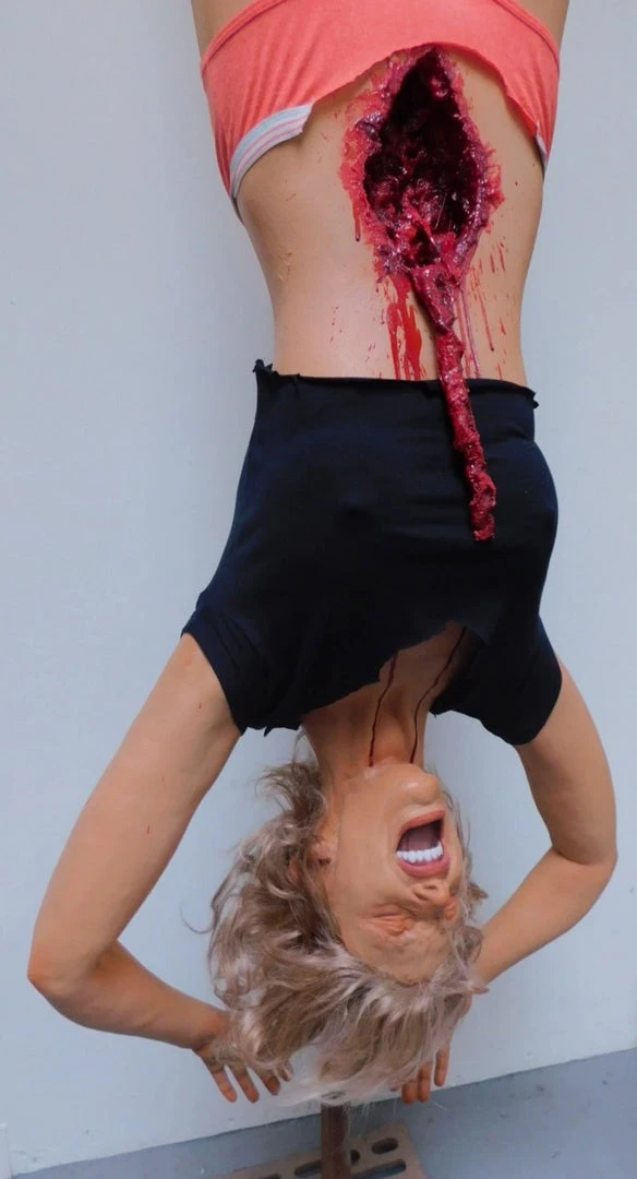 Lifecast Agatha female body features reinforced hanging armature running within the body to be hung at the wrists. Cut open belly with exposed guts. Closed eyes with open mouth in a scream, arms above head. Includes hair and clothing.
