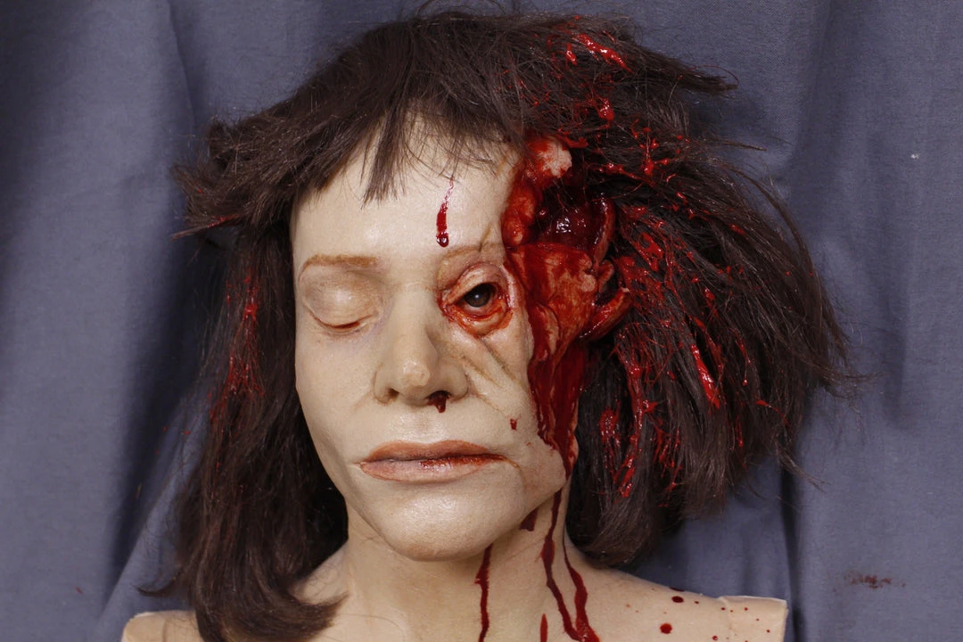Life size, life cast female head with entry wound in temple and exit wound on side of head. Cast in high-strength, high-detail urethane rubber skin. Includes wig and eyebrows.