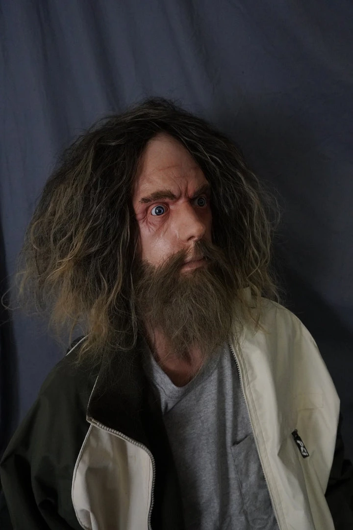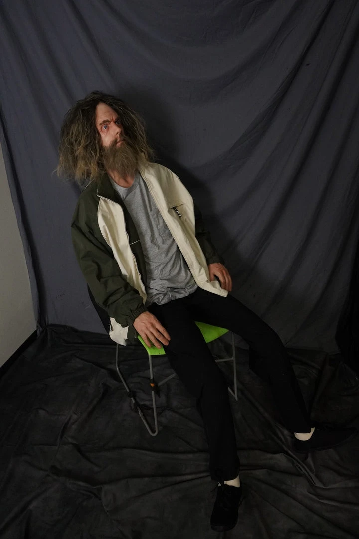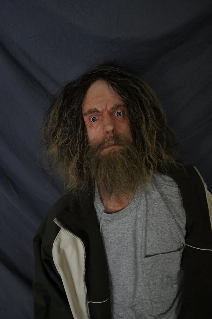 Long Bearded Frank Dummy has soft pose and stay legs that allow him to sit, lay, and do many other non-standing poses. Long hair, beard, clothing with jacket.