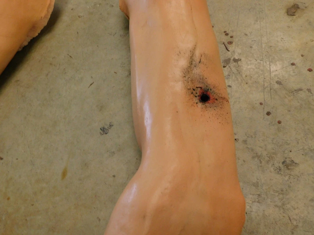 Lifecast male arm with closed fist. Cast in high durability rubber with a gunshot entry wound on one side and exit wound on the other. Great for triage and tourniquet training.