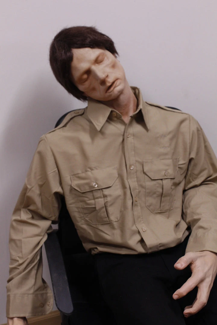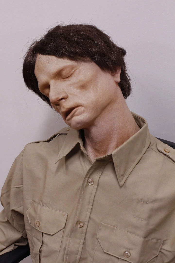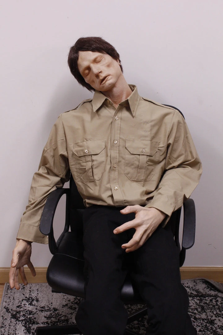 Is he sleeping or dead? Either way, Alan is out of commission. Head and hands are cast in high strength dura rubber for durability and mounted to a poseable mannequin that can sit, lay or stand. Dressed in a security guard uniform.
