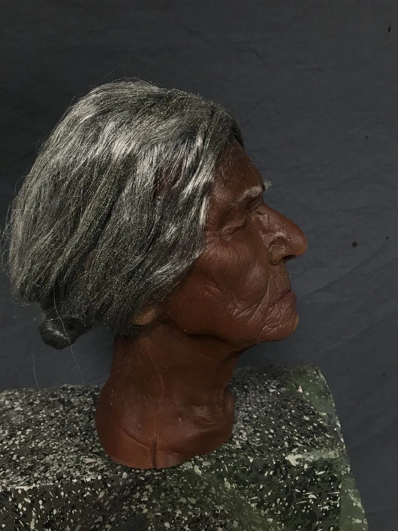 Polyfoam rubber elderly female head with deep wrinkles. Does not have shoulders. Tan skintone pictured.