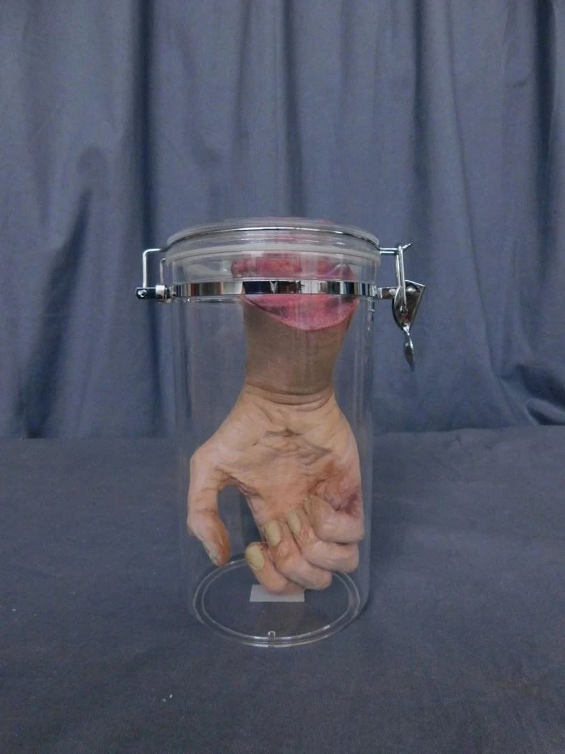 Lifecast twisted hand cast in solid rubber in a shatterproof acrylic apothecary jar.