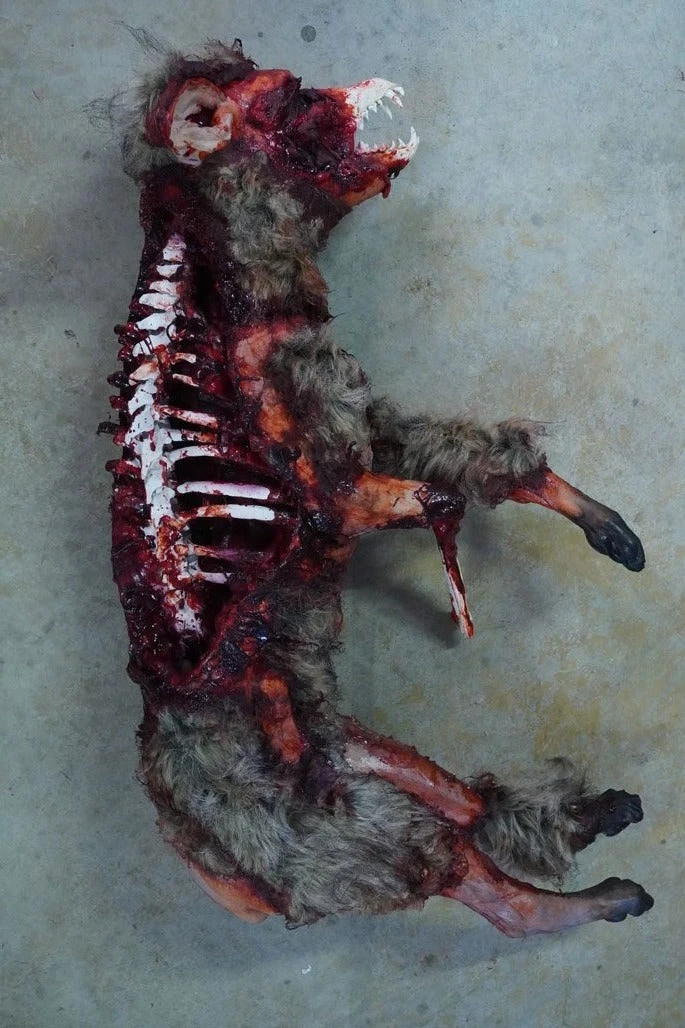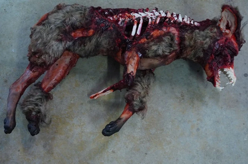 Life Size partially skinned coyote with exposed bones and gore.