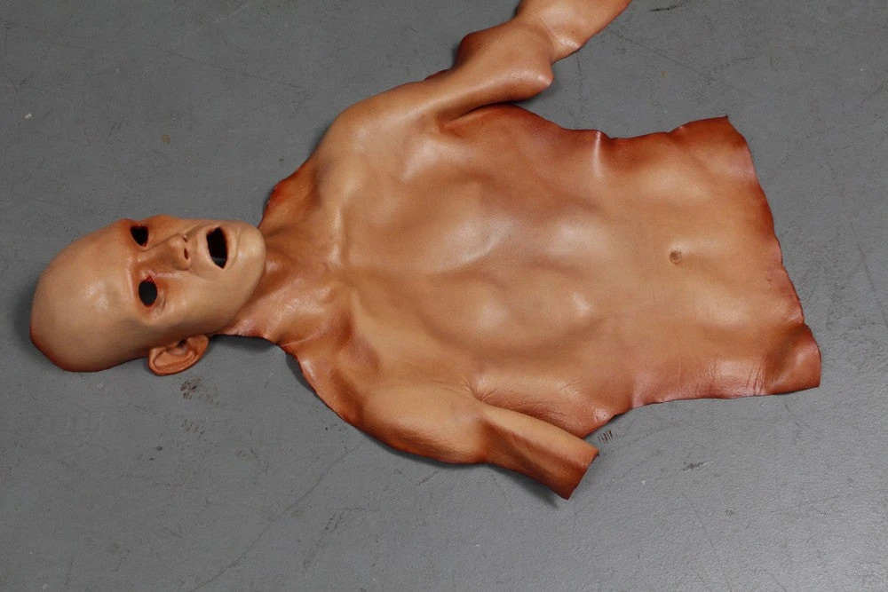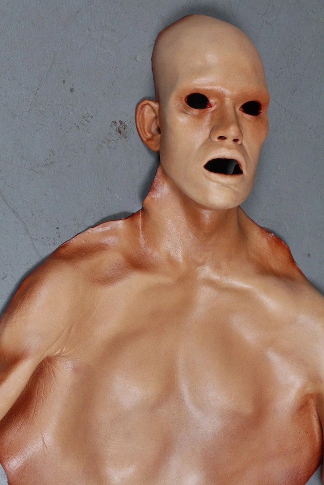 Durable hi-flex rubber skin of a torso, arm, and face of a man. Open eyes and open mouth. Flesh toned outside, blood colored inside.