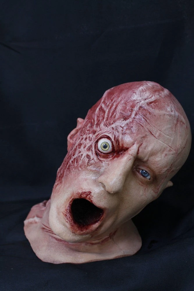 Our Floyd head features one protruding eye and veins on half of its head. The head is turned to the left and the mouth is open.