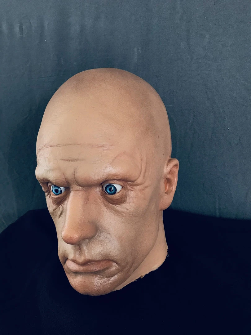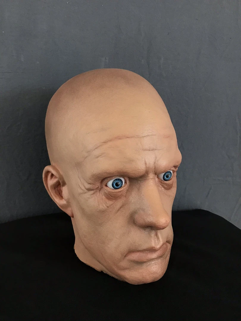 Frank head is a lifecast male head with some character wrinkles and an intense look on his face. Perfect for soldiers, villians, mad scientists and tough guys. Prop has full head and partial neck. No shoulders, pour spout mark on back of head.