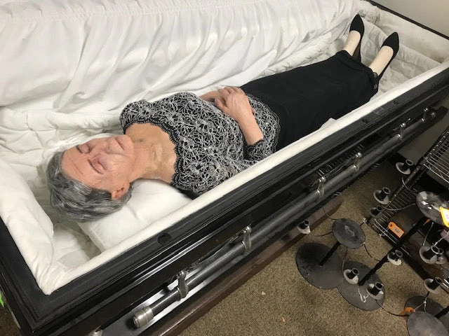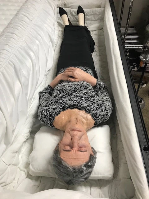 Poseable foam rubber body with lifecast female Agnes head with wig. Clothing subject to change, but appropriate for an open casket scene. Casket not included.
