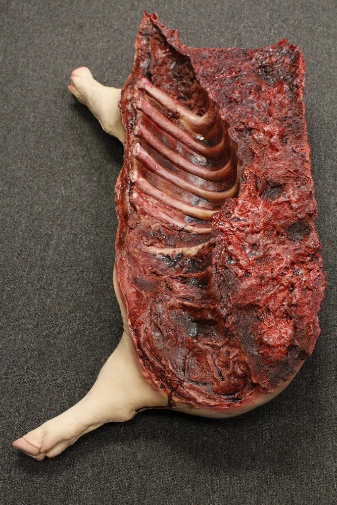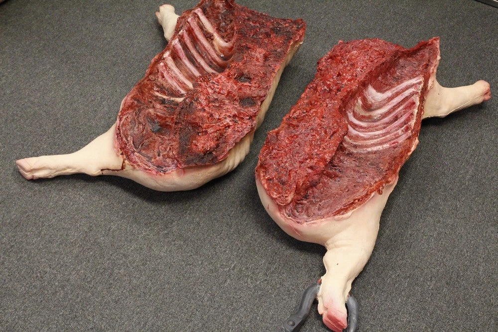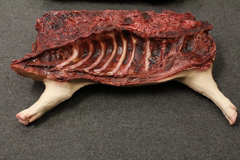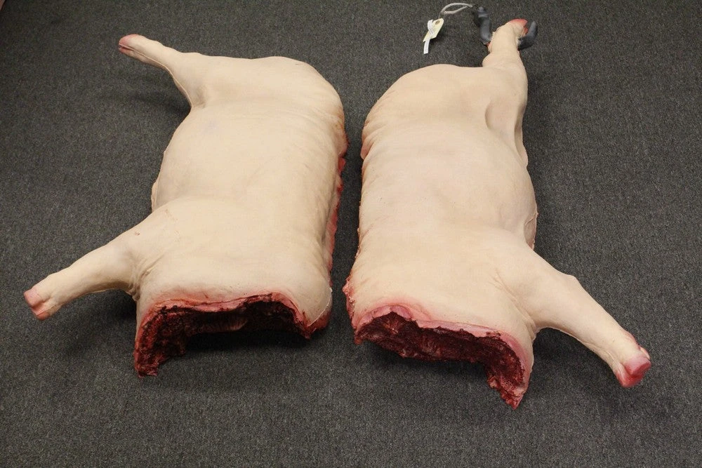 Hanging from hook embedded in the leg, gory gutted lifesize foam rubber pig split in half.