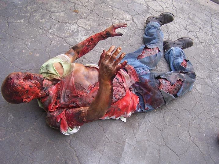 Half Anatomical Dummy Jack has lifecast head, arms, and full torso down to the jointed waist, as well as poseable cloth legs, so that he can move and be arranged realistically. This Jack body comes with extensive bomb and burn wounds as well as tattered clothes. 6’3″ tall.