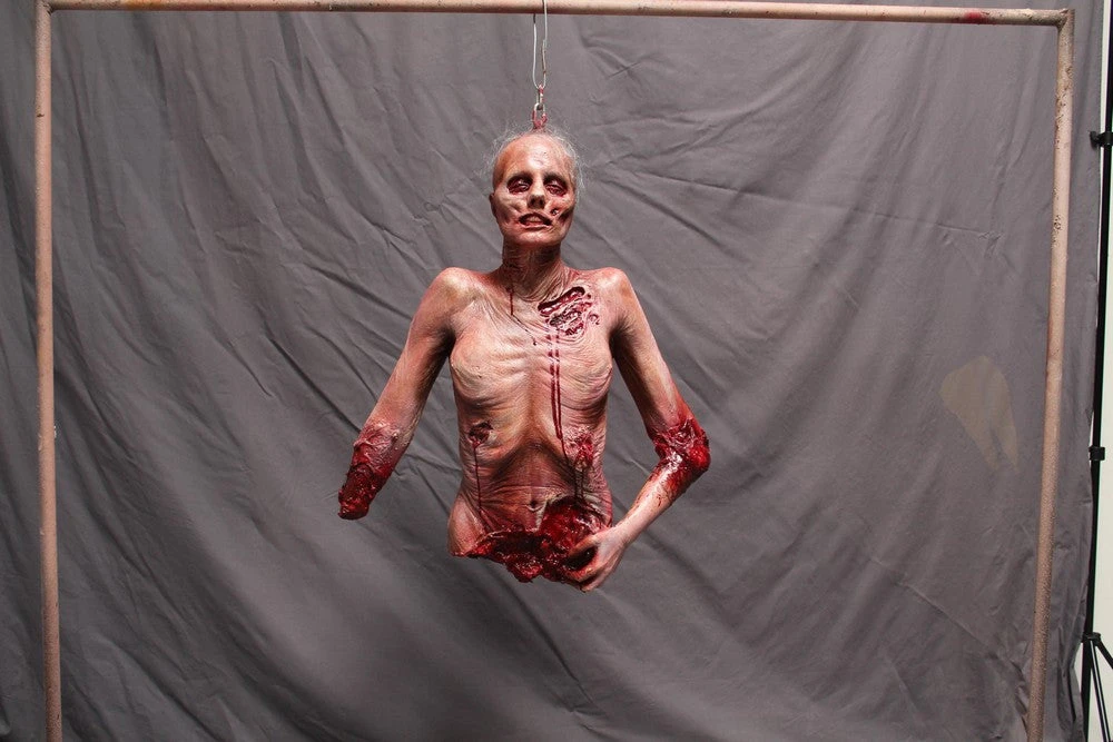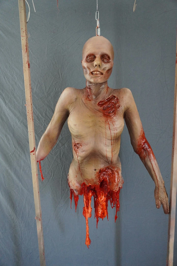Lifesize female zombie or cadaver torso meat reinforced for hanging by embedded chain.