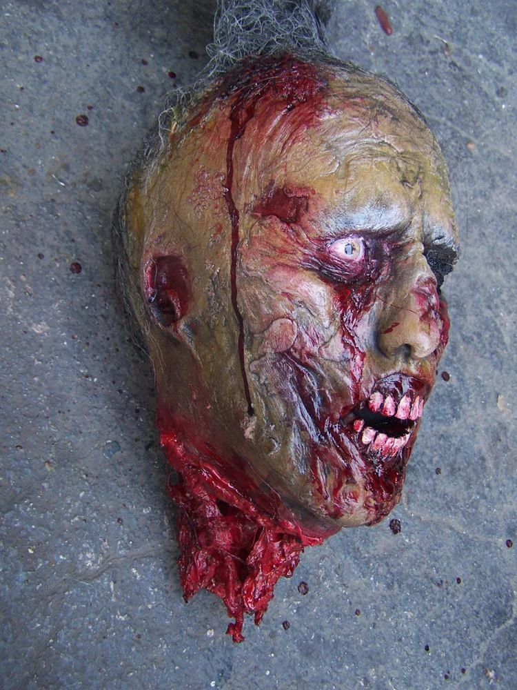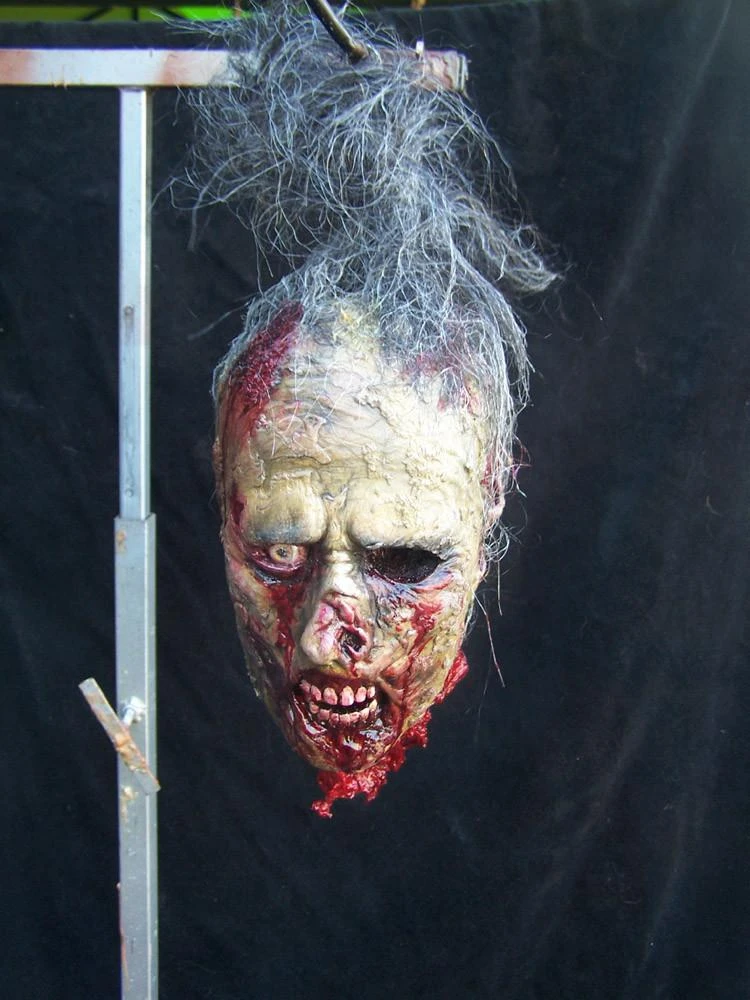 Zombie Kemmler has one open eye, one hollow eye socket, decaying skin, and dripping gore. Also has a wire hidden inside his hair for holding or hanging.