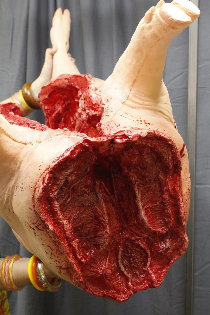 Hanging from hook penetrating the leg, gory gutted lifesize foam rubber pig with a long incision starting at the neck and ending at the rump and no head.