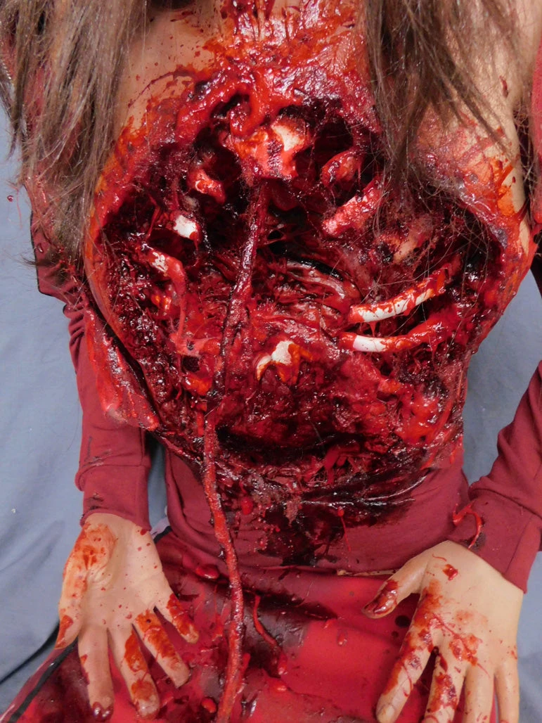Gory female sitting cadaver body with ribs cut open and vinyl heart hanging by a vein. Top and bottom half come apart for easy shipping and storage.