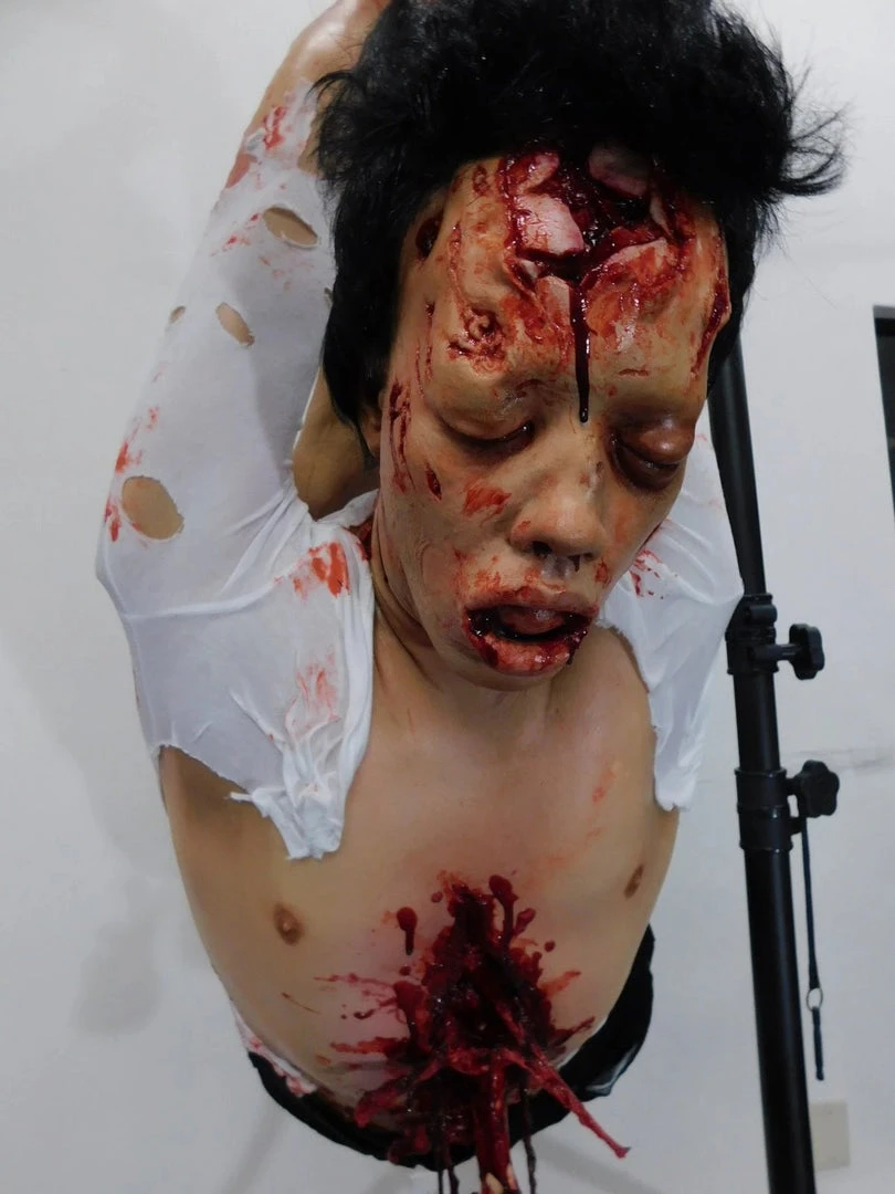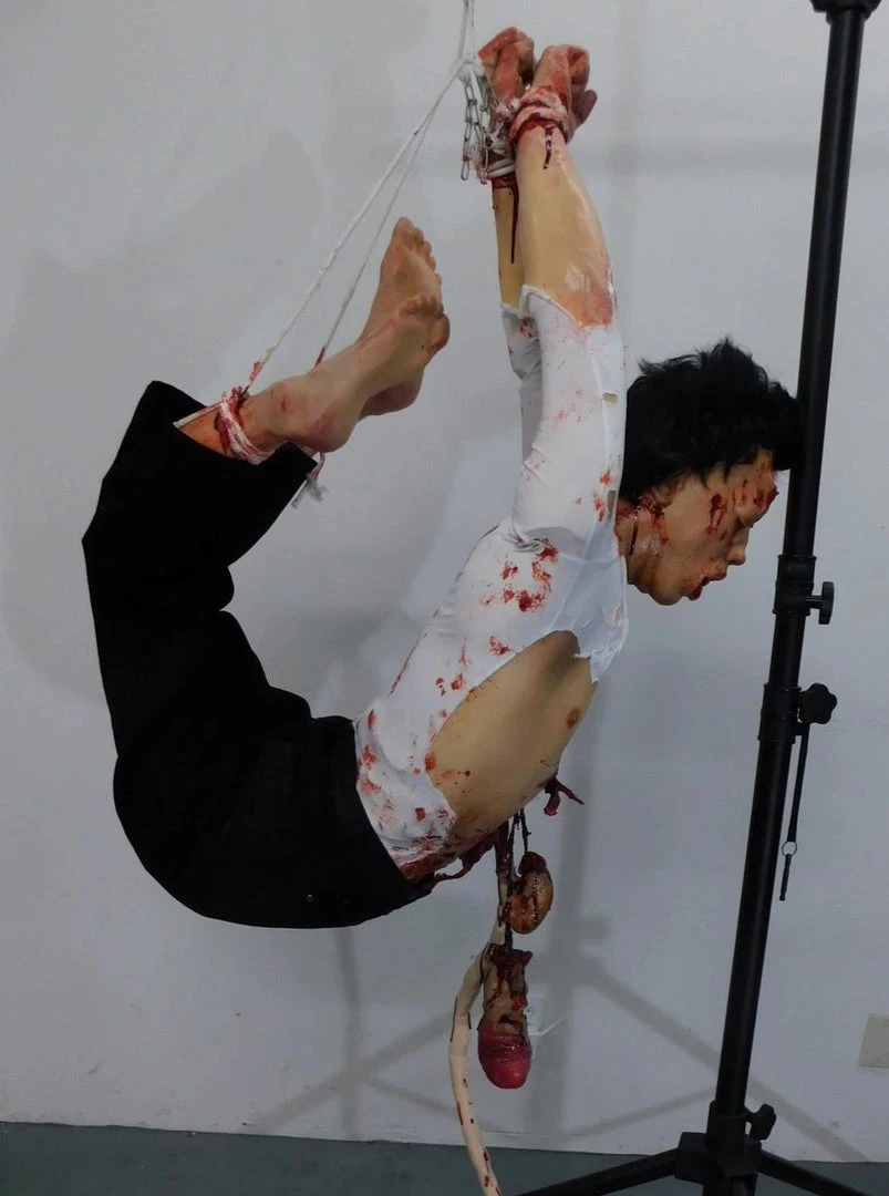 Lifesize Oscar half anatomical dummy hog-tied with gory organs dangling from an open chest cavity. Gruesome haunted house or escape room prop.