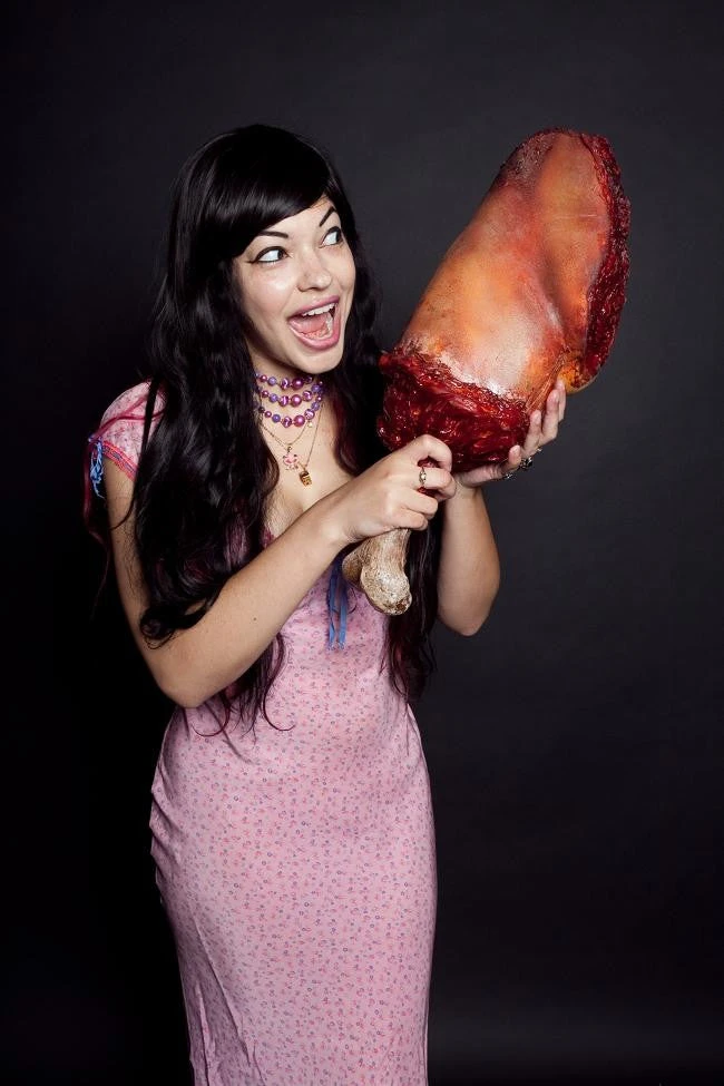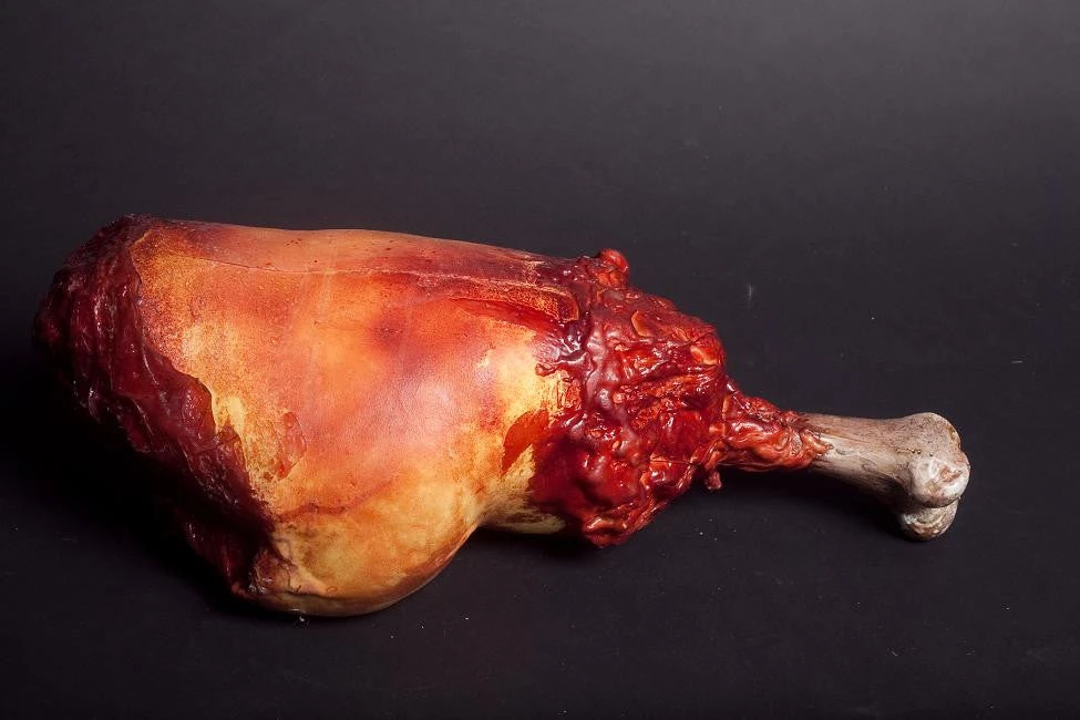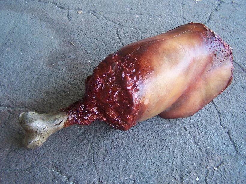 Everybody wants the drumstick. This gory foam rubber half leg has an exposed femur perfect for holding and munching. A great prop for any cannibal, zombie or creature.