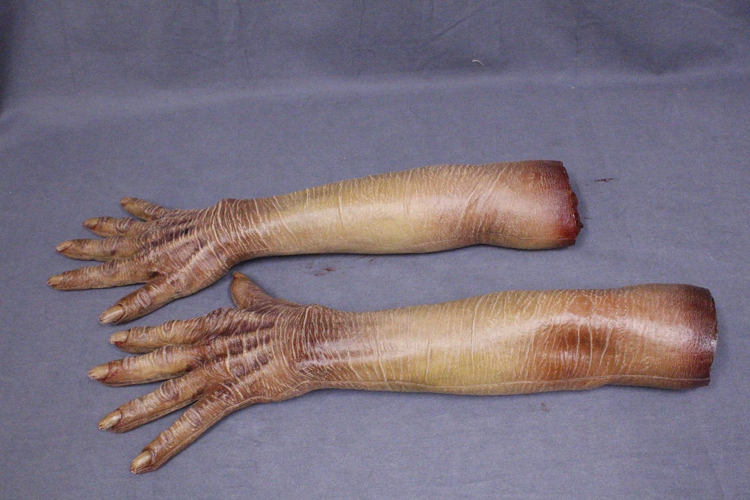 Foam rubber creature hands with monster details like curved nails and popped veins.
