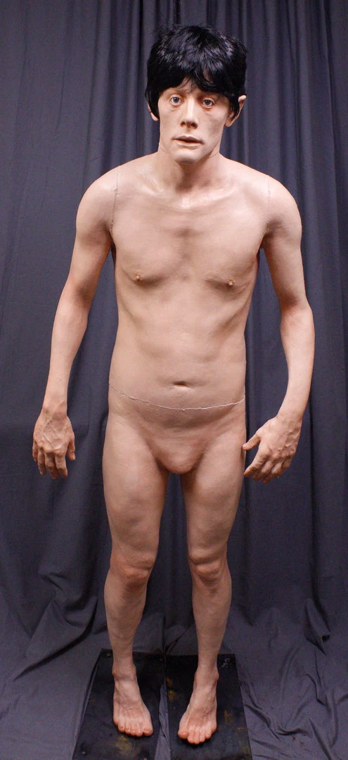 Joe is a lifecast body over 6 feet tall. Body features poseable arms and neck. Open eyes and neutral expression. Male, young to middle age.