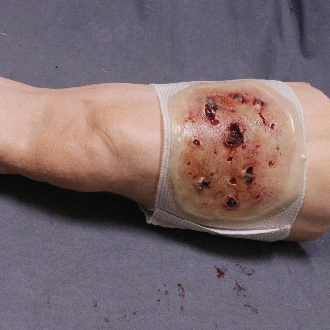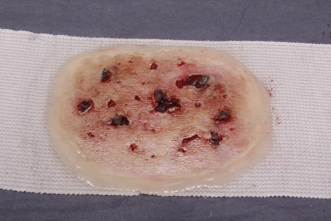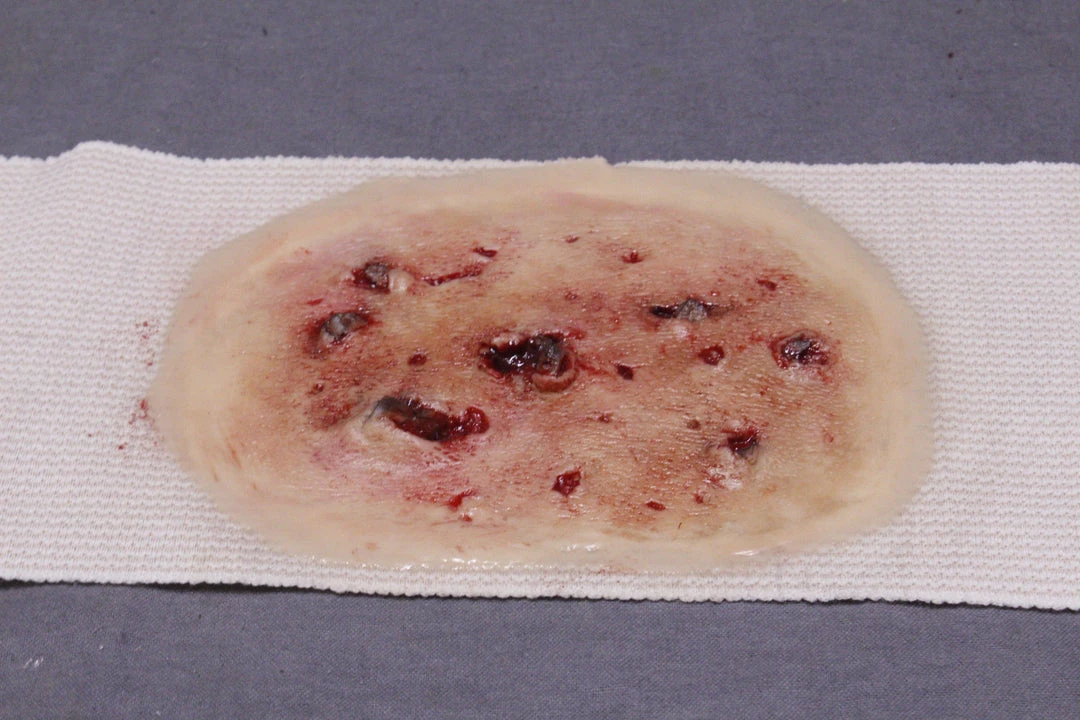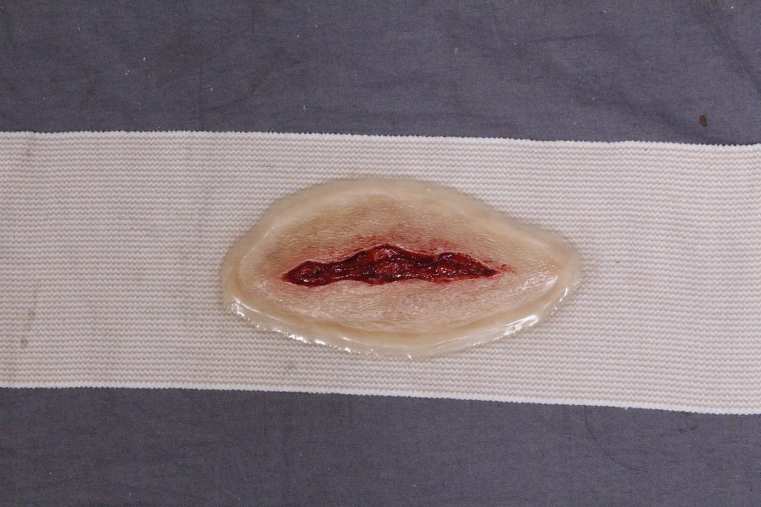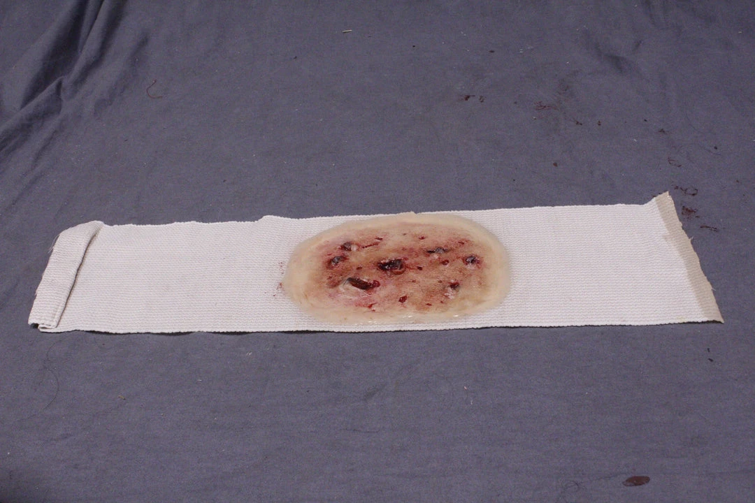 Dura rubber moulage kit on elastic bands for strapping wounds to fake arms and legs. Great for training. Not a makeup product. It contains: